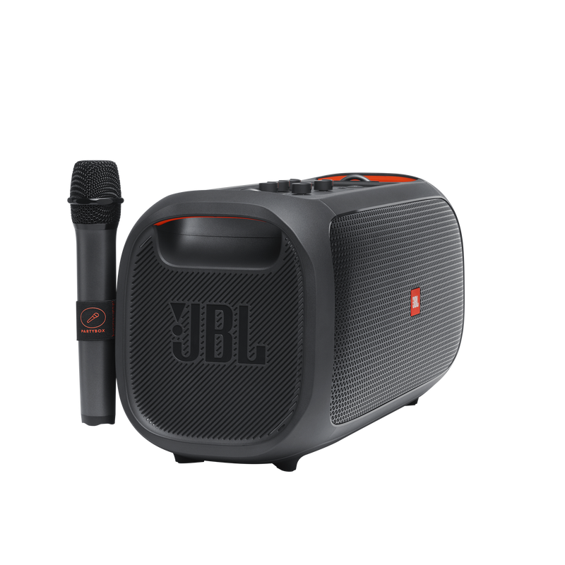 From beach parties to festivals, the JBL PartyBox On-The-Go lets you see, hear and feel the beat. Turn it up loud with 100 watts of powerful JBL Pro Sound, synched to a dazzling light show. Access your favorite tunes with Bluetooth, USB, AUX and TWS (True Wireless Stereo) connectivity, grab a friend and sing your hearts out with the JBL wireless mics, or use the instrument input to play along. With a bottle opener, padded shoulder strap, rechargeable battery and IPX4 splash-proof protection, the JBL PartyBox On-The-Go has everything you need to get the party started—and take it with you.