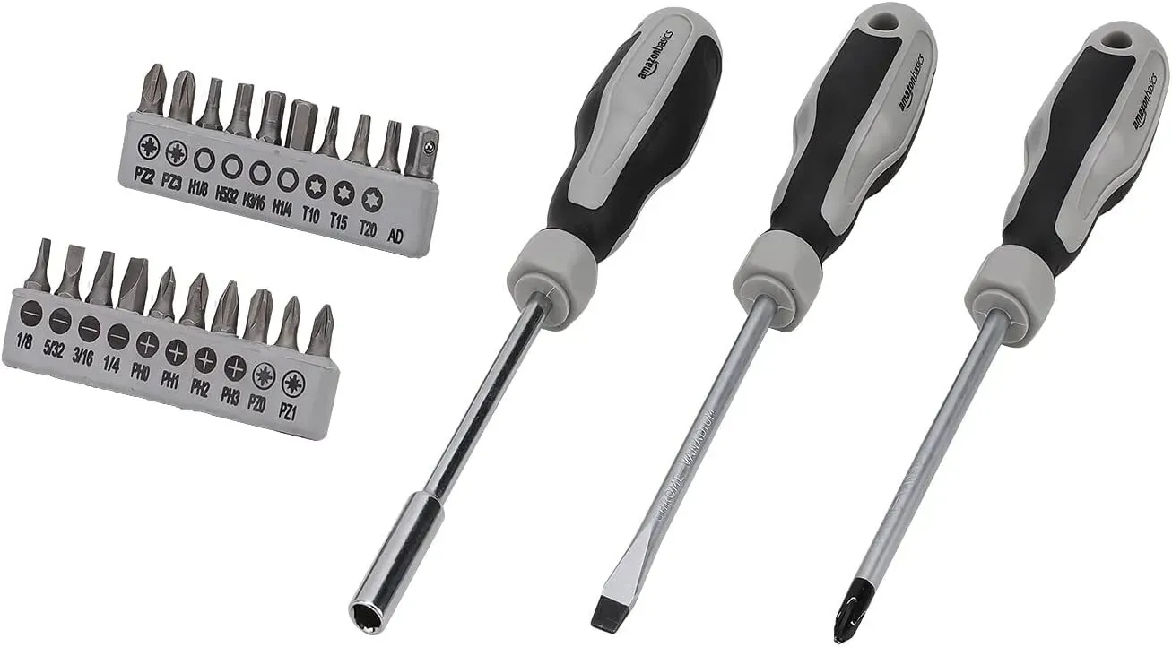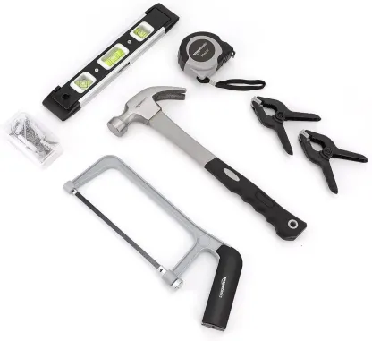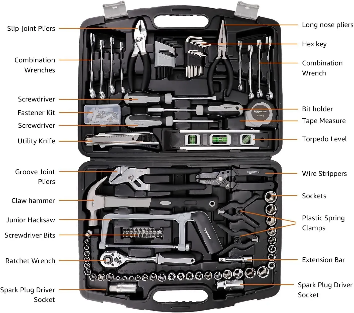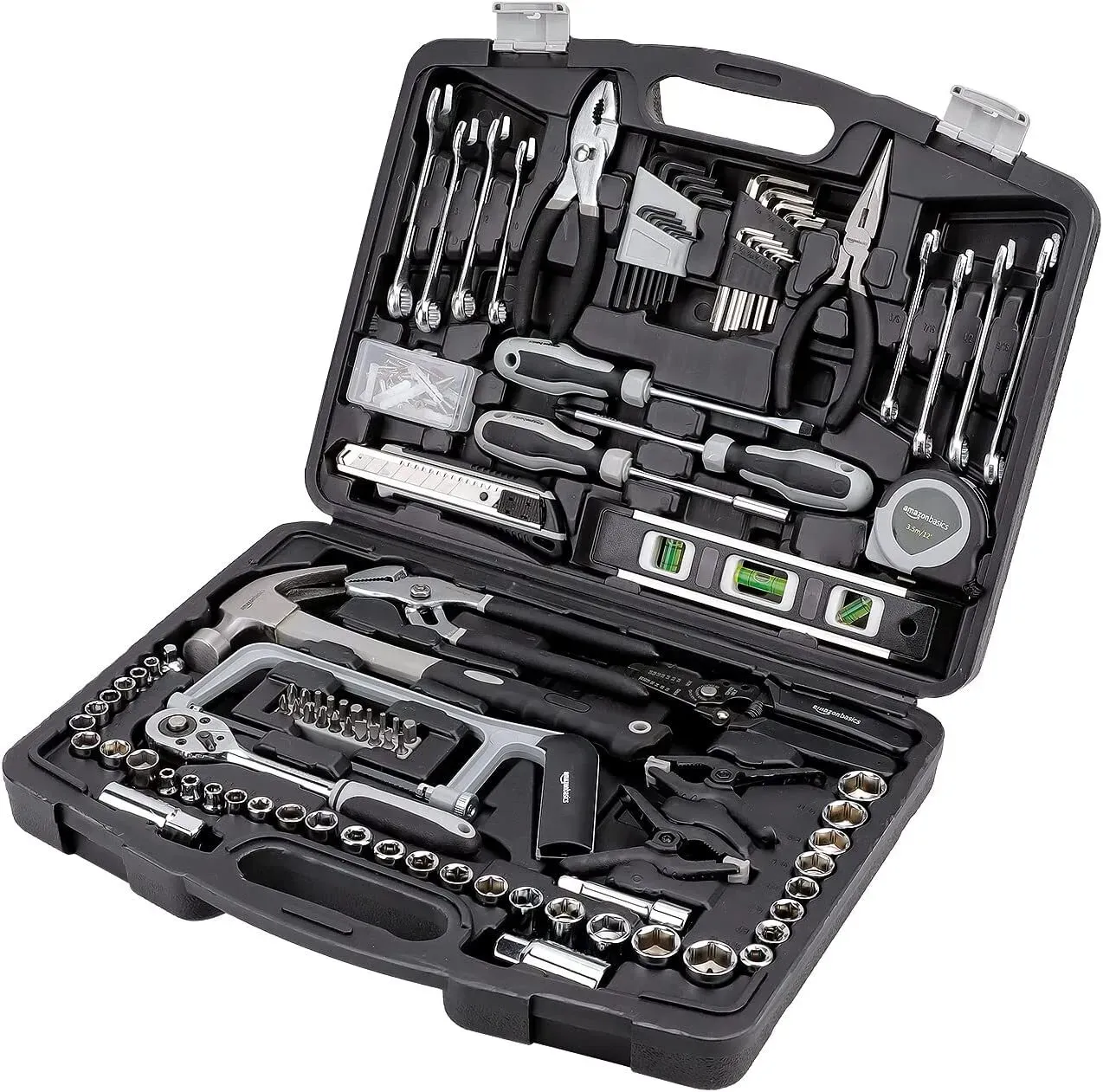 - 173-piece hand tool set for basic household repairs and everyday projects; includes 8 combination wrenches, 3/8-inch ratchet wrench, 22 hex keys, 6-inch slip-joint pliers, 6-inch long nose pliers, and more (scroll down to view complete list)