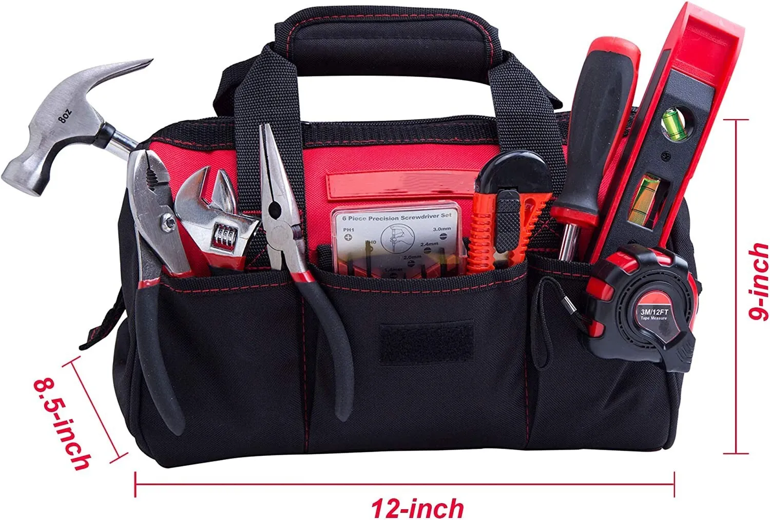 - Durable 12-inch tool bag is constructed by 600D polyester fabric for durability, wide-open mouth for easy approach to the tools. 6 pockets outside and 6 pockets inside for well organization.
