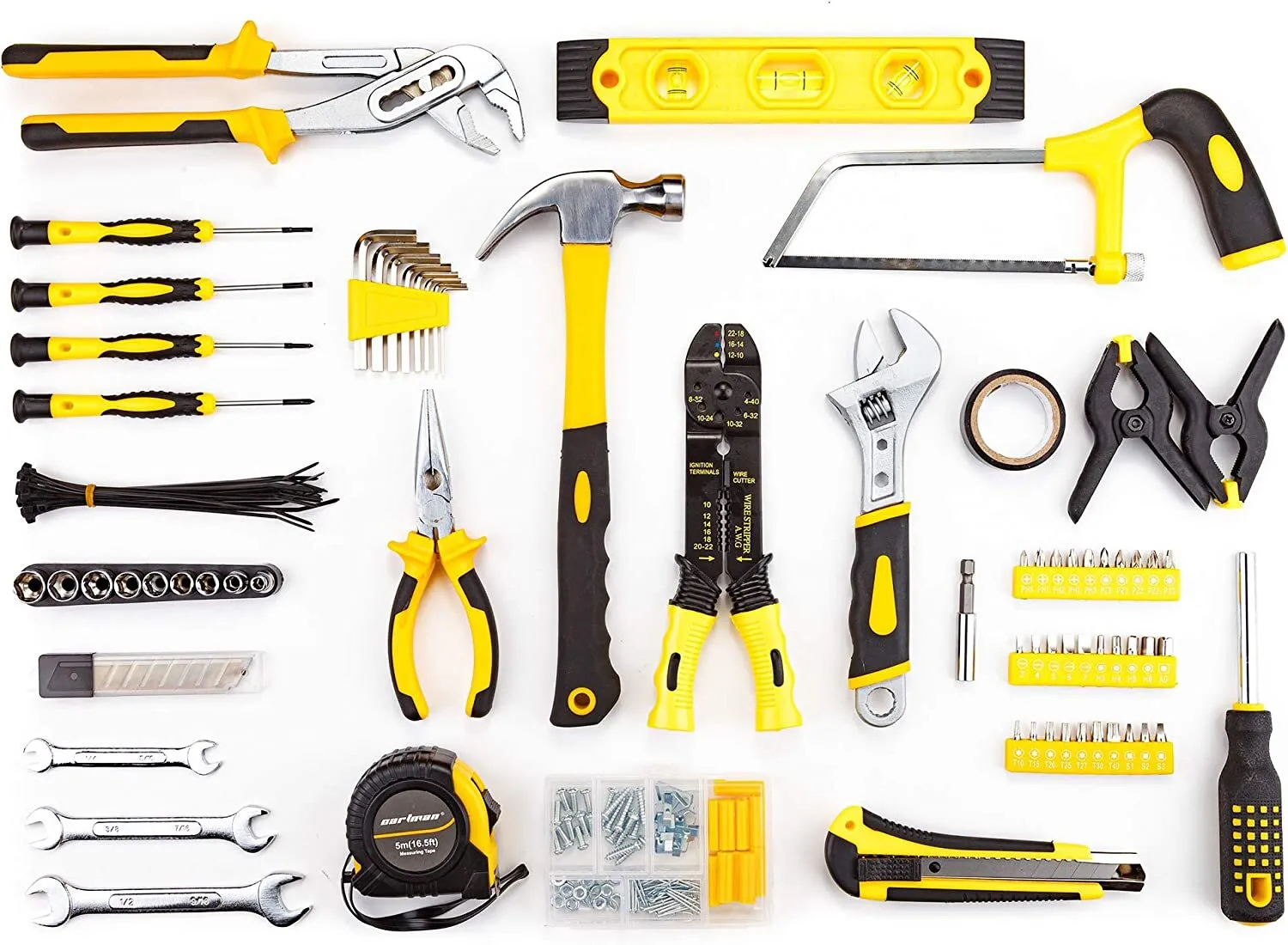 Includes comprehensive assortment of professional-grade wrenches, a complete range metric-sized sockets and precision screwdriver, hammer, tape measure, pliers, wrench,and etc.
