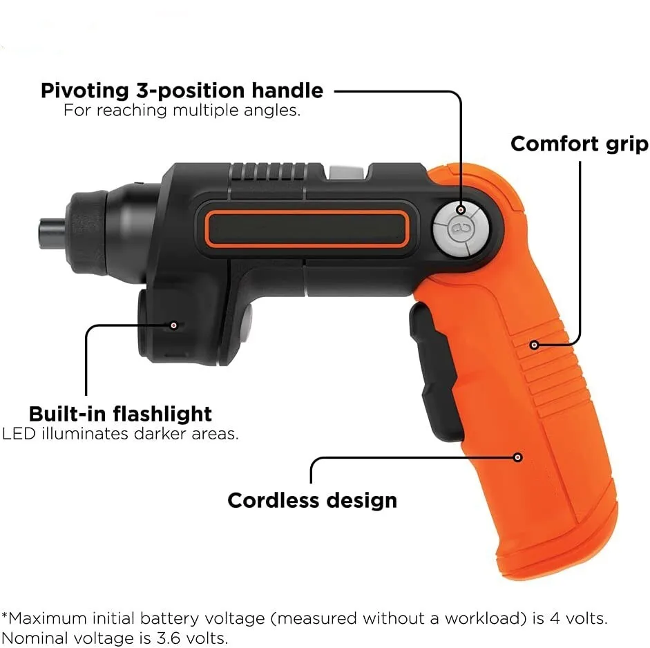 INCLUDES – (1) BDCSFL20C 4V MAX* cordless rechargeable screwdriver, (2) screwdriving bits, (1) charger.